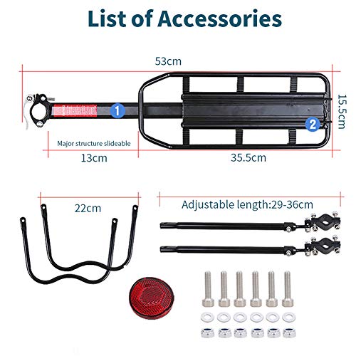 【Rack Details】Durable and solid aluminum alloy would be used in producing a top quality bike rack for giving it a high weight capacity. Carries up to 110 lbs. (50 kg) ,seat size 35.5 x 14cm/13.8 x 5.5 inch (L x W)-Rack Size: 53 x 17cm/20.7 x 6.6 inch (L x H)could make mountain bikers or road bikers feel carefree since they are able to put most loads on the bicycle carrier rack