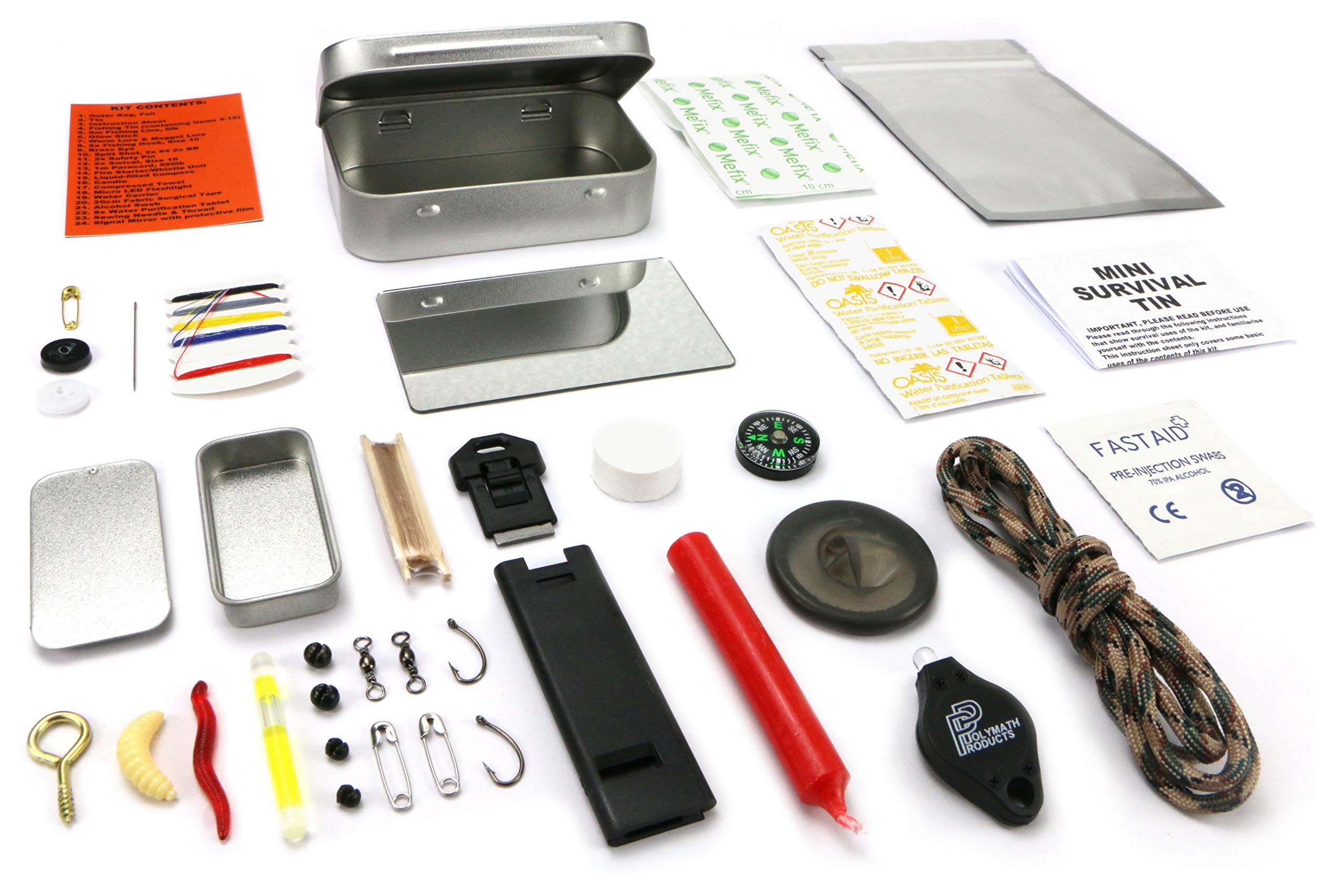 A carefully selected kit of survival essentials, packed into a compact hinged metal tin. This kit fits easily into even the smallest pocket or pouch, and comes supplied in a heavy-duty waterproof outer bag to keep the kit dry and secure.