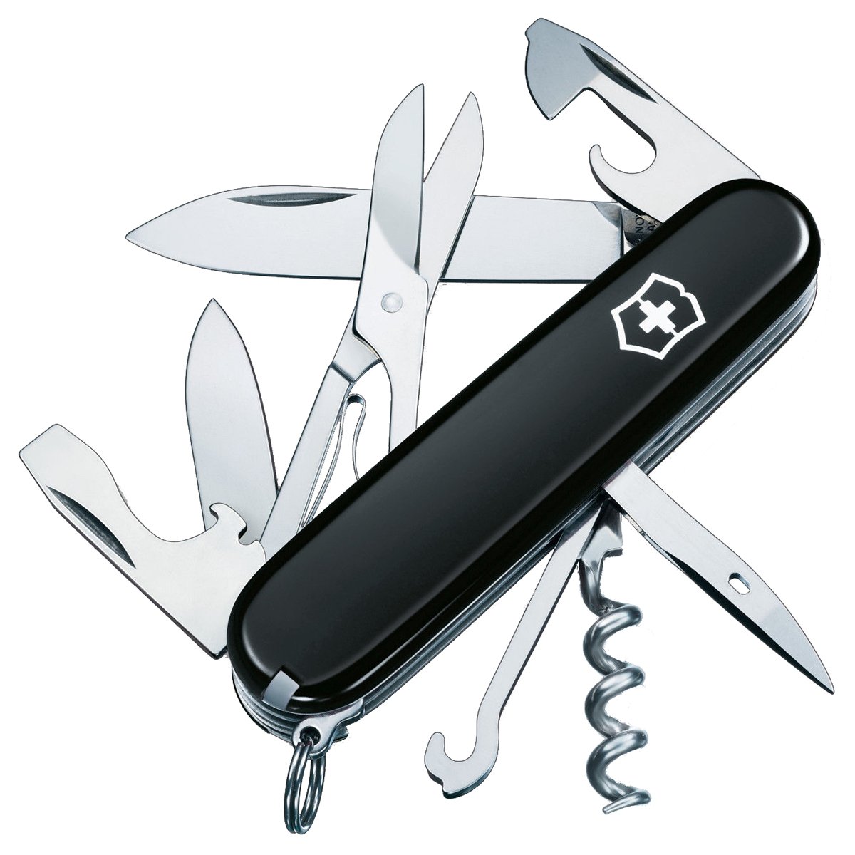 FUNCTIONS: Swiss-made pocket knife with 14 functions. Blade large, Blade small, Corkscrew, Can opener, Screwdriver 3 mm, Bottle opener, Screwdriver 6 mm, Wire stripper, Reamer punch and sewing awl, Scissors, Multipurpose hook, Key ring, Tweezers, Toothpick.